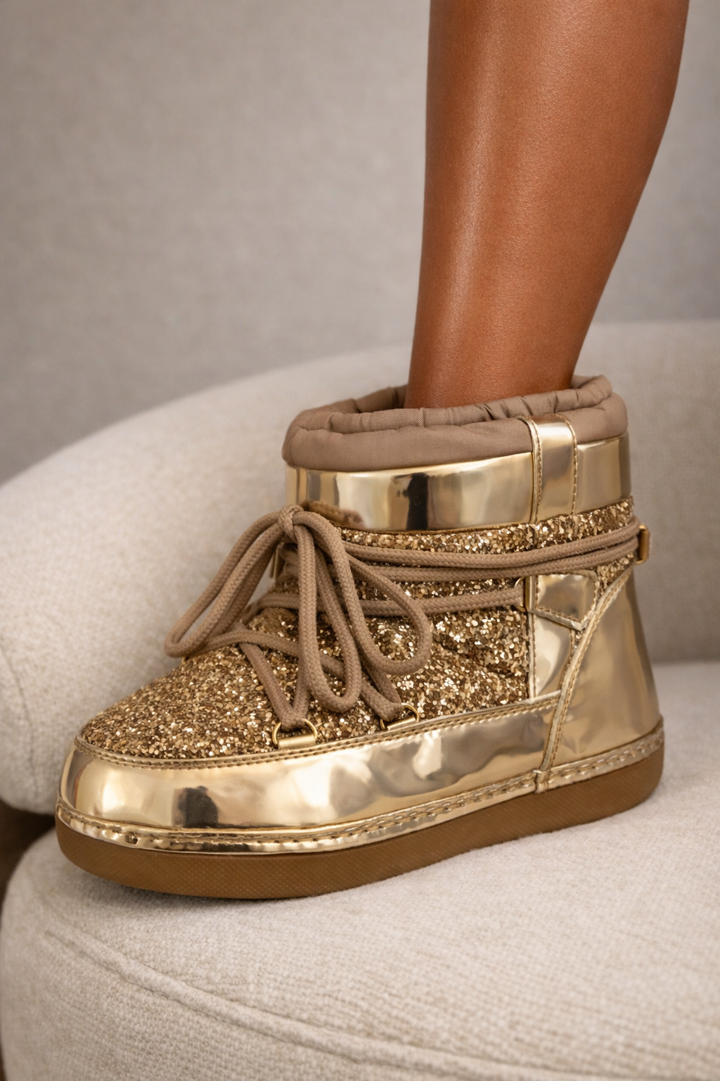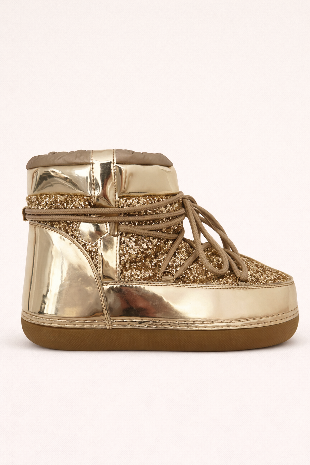 Descubra o luxo nos detalhes com esta deslumbrante moon boot em tom rosa gold. O acabamento metálico espelhado reflete a luz com sofisticação, enquanto a parte superior em glitter acrescenta um toque de brilho sutil e encantador. O design robusto e acolchoado garante conforto absoluto, e os atacadores decorativos complementam o visual moderno e elegante. Ideal para quem quer aquecer os pés com estilo durante os dias frios — uma peça que combina glamour com praticidade.