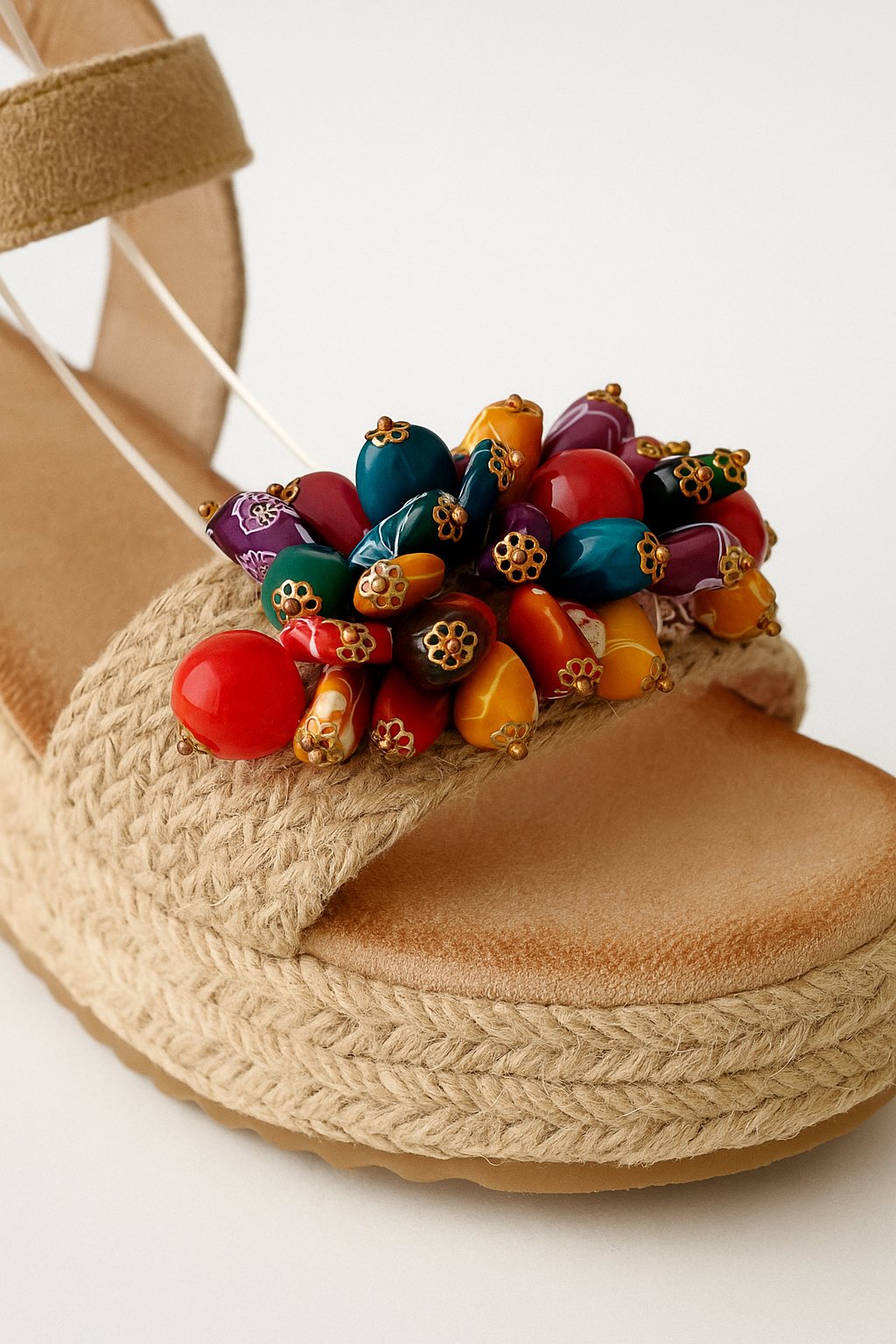 Detalhes: Aplicação de contas artesanais coloridas com acabamento metálico dourado